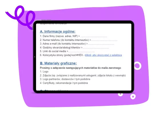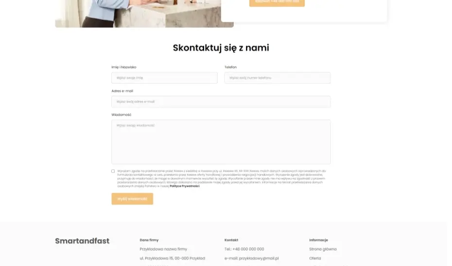 Konieczne jest dostarczenie minimalnej ilości treści w postaci opisu Twojej firmy, opisu usług itp. Co pozwoli najlepiej przedstawić zakres Twojej oferty. Jeśli nie czujesz się na siłach, możesz skorzystać z przygotowanych pomocniczych opisów oraz gotowych wypełniaczy. Dodatkowo zespół Smart and Fast pomoże Ci w przeredagowania treści jeśli będzie taka potrzeba.